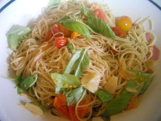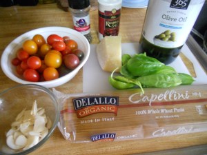 I usually go for a whole-grain blend that is about a 50/50 split between regular and wheat flour pasta. I decided to go for something a bit different this time around. I bought Delallo’s Organic 100% whole wheat Capellini. It was a bit pricier for me, at around $3.39 in Whole Foods but since I’m just cooking for myself here, I figure it will stretch out for awhile. That’s one of the lovely things about pasta. It’s so wallet-friendly and you can really do anything with it and have it last. As for pasta shapes, there are dozens. Dozens of dozens. And each go well with different types of sauces depending on how hearty you go, if you’re baking, using a cream sauce, etc. My favorites tend to be capellini, penne, rotini, or farfalle.