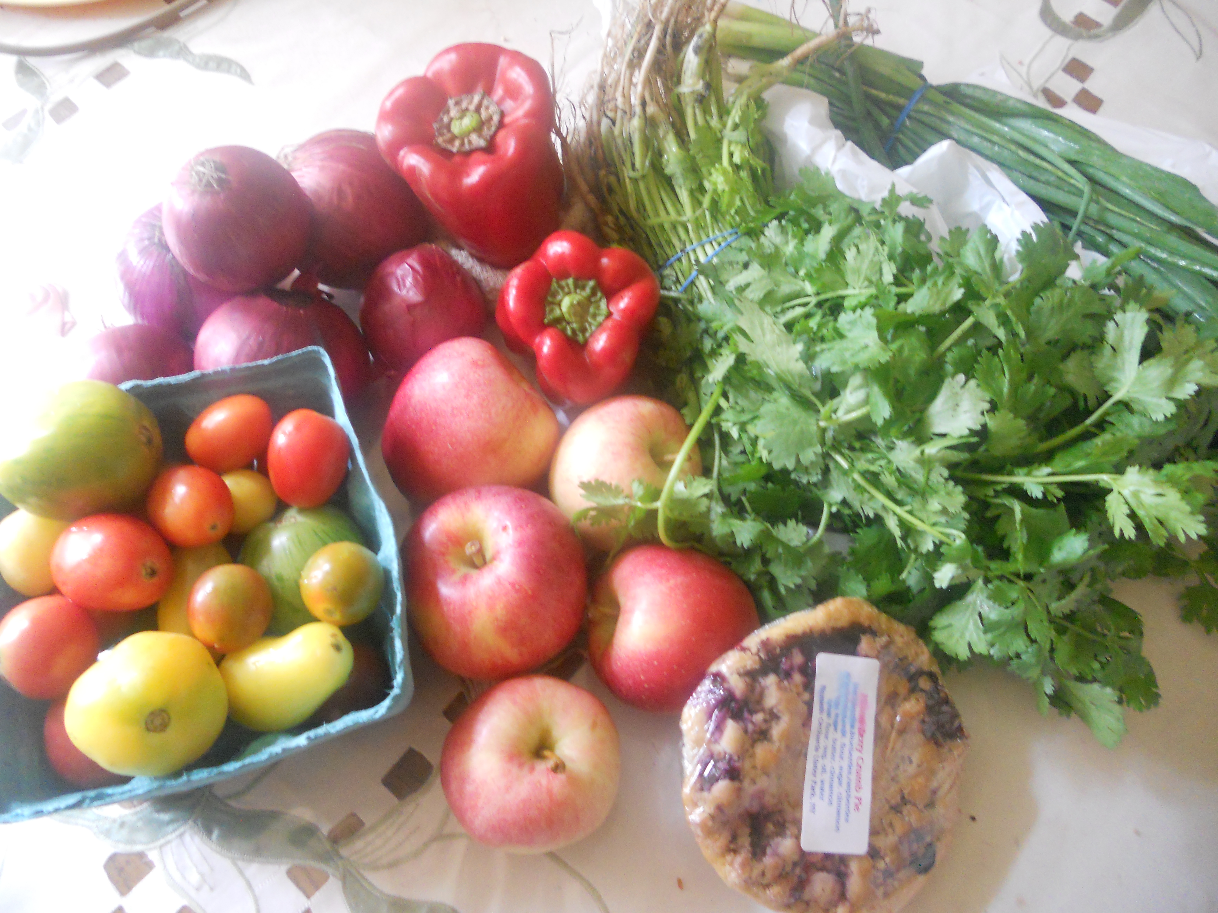 I got some beautiful heirloom tomatoes, red onions (which goes like water in my household), red peppers, cilantro, scallions, a small mixed berry crisp, and the absolute topper to my morning- GALA APPLES. Please see my earlier post about apples. If you haven’t read it, here’s a spoiler; I LOVE APPLES.