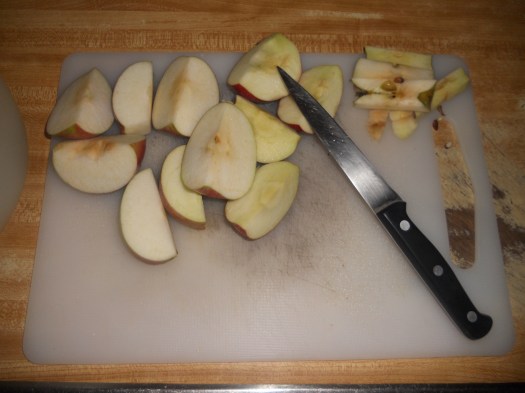Take your apples and get to chopping. I don’t own an apple corer because I usually end up fighting with it more often than I’m removing cores. I find it easiest to just slice the apple down the middle, then cut down to the right and left of the core, leaving me with three chunks. Finally, I just cut that last slab on the end and I’m left with the core and seeds completely removed. It may not be the most economical since you’ll lose some of the flesh, but it gets the job done.