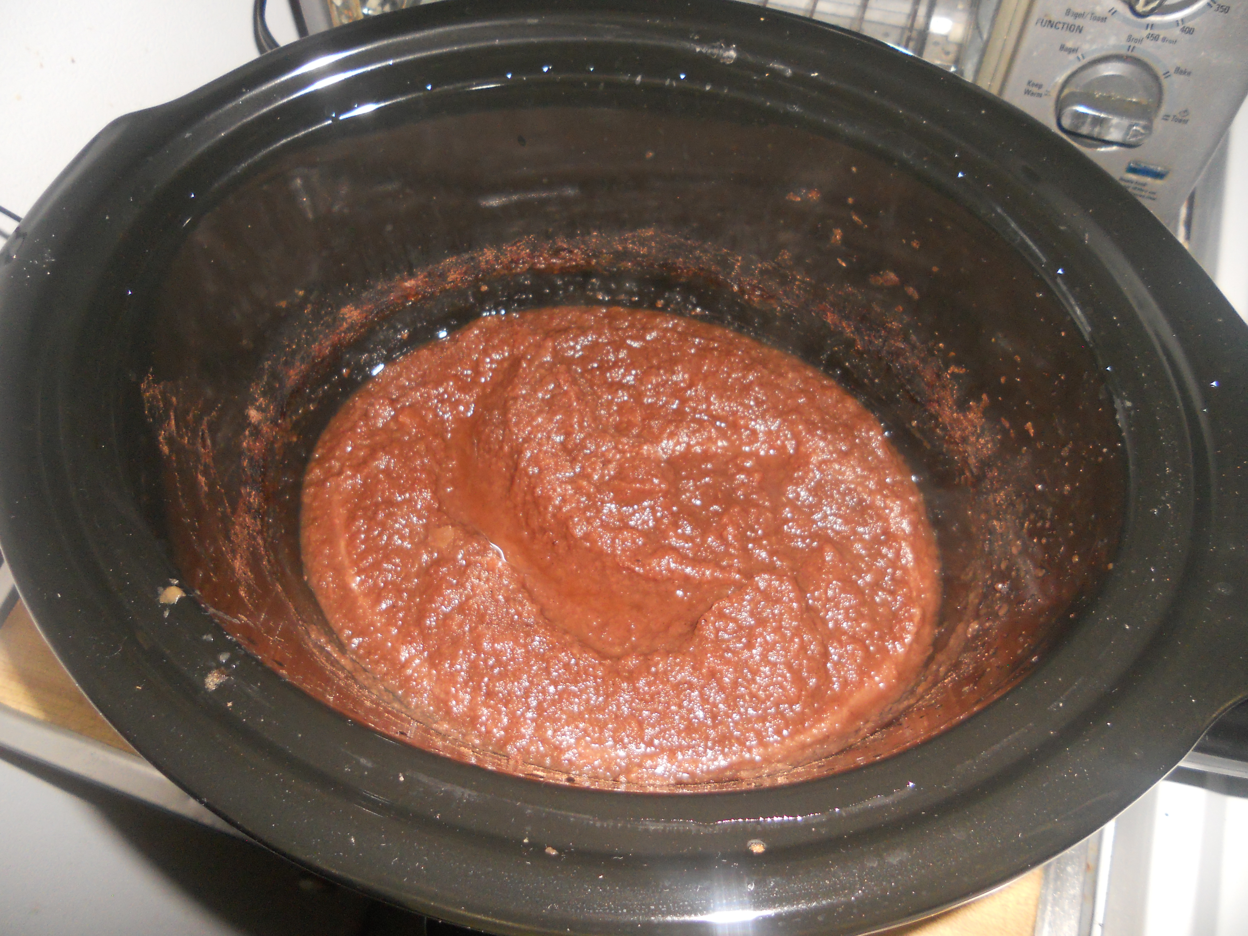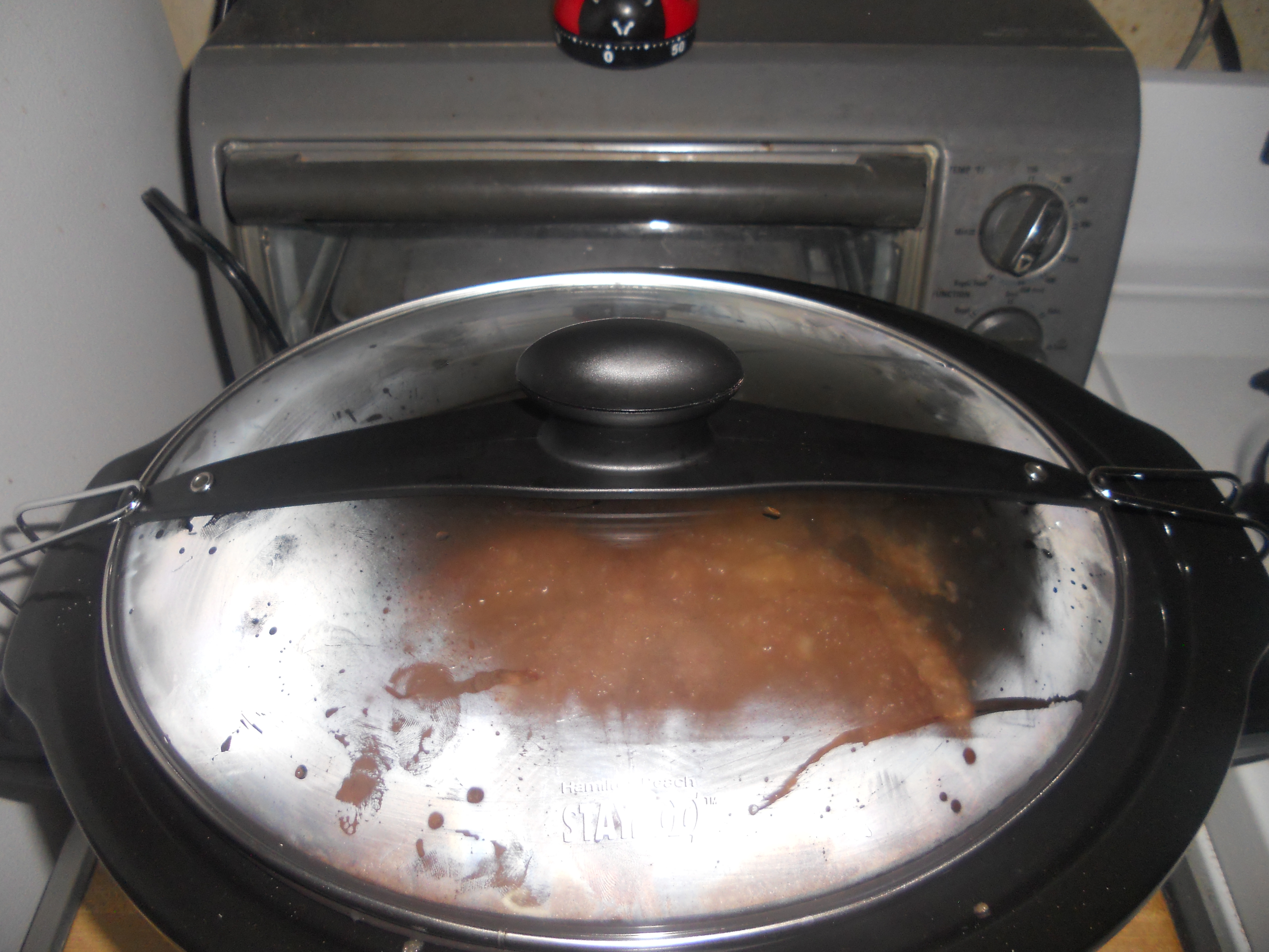 After the first hour is up, reduce the heat to low and set your timer for 12 hours. That’s right, 12 hours. I got this started right before I went to bed and checked on it in the morning before I left for work. Thankfully (and I owe him tons for this) my brother was around and able to check on it during the day, stirring it whenever I frantically texted him to make sure it wouldn’t get sticky or burn. I almost asked for him to take pictures of it on his phone and forward them to me but even I thought that was going a bit too far. I promised samples to people tomorrow and I was terrified I was going to have to deliver tasteless brown glop or just buy apple butter and pass it off as my own out of sheer embarrassment.