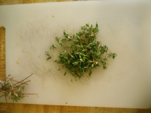 An important note about chopping fresh herbs: Herbs like rosemary and thyme are on the stem which you don’t want to include in your food. They not only hard to chew, they’re extremely bitter and can leave a bad aftertaste. The easiest way to remove those tiny thyme leaves is to hold the stem vertically with the leaves pointing upwards, and to slide your fingernails down from top to bottom. This will scrape off all the leaves in one move. Once you have all that you need, throw the stems away, and chop up the remaining leaves. Easy right? Okay, let’s keep moving.