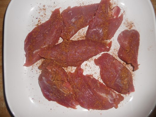 I pre-measured the spices and put them in a small prep bowl to make it easier to season the pork once I got to this stage. I was only feeding two people with this meal so I bought about ¾ lb of pork tenderloin which would be more than enough. When you buy your meat just be sure to trim any extra fat and then cut in even sized medallions. Once the pork is cut and ready, just sprinkle on the spice mixture on each side making sure to coat evenly.